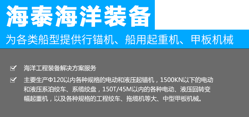 江蘇海泰海洋裝備有限公司位于素稱“銀杏之鄉(xiāng)”的泰興市,2018年投資建設(shè),至今已經(jīng)成為產(chǎn)品研發(fā)、生產(chǎn)制造,調(diào)試服務(wù)為一體的設(shè)備配套企業(yè)。公司從事海洋裝備(設(shè)備)及配件的制造、設(shè)計、安裝,維修;船用錨機(jī)、絞車、起重機(jī)、舾裝件、電氣設(shè)備、環(huán)保設(shè)備設(shè)計、制造。公司成立以來,就與中國船舶工業(yè)集團(tuán)公司第701所、702所、704所、708所、上海船舶研究設(shè)計院等多家船舶科研院所建立了技術(shù)合作關(guān)系,產(chǎn)品應(yīng)用于......